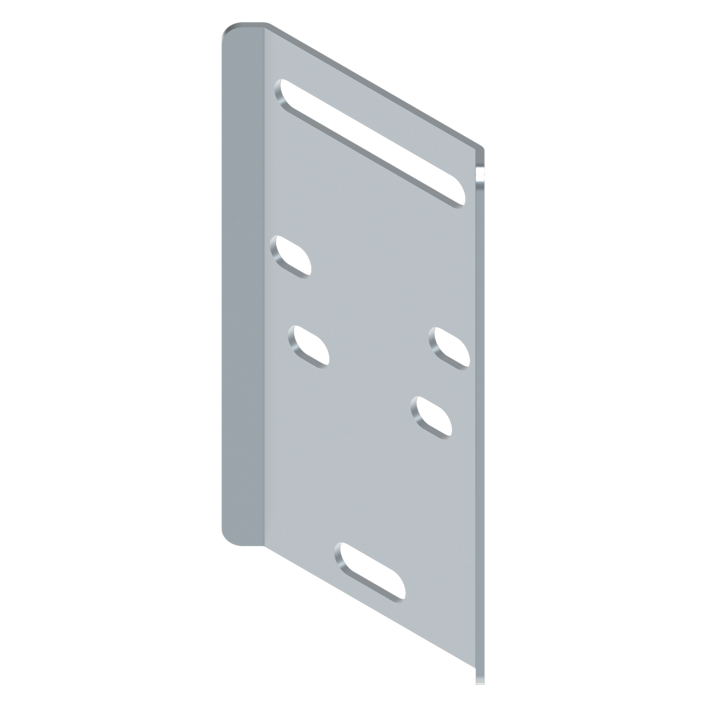 Reinforcement plate, to be mounted on the outside of the vertical angle at the bend level to absorb the force of doors over 100 kg on TS100 systems. To be mounted with 4 pcs Item No. 8280 +8080.